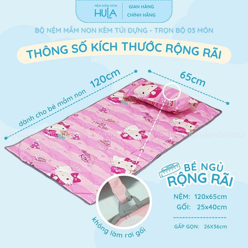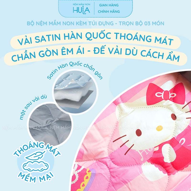 [CHÍNH HÃNG HULA] Bộ Nệm Mầm Non 3 Món Họa Tiết Hello Kitty - Vải Satin Hàn Quốc, Chống Trượt An Toàn, Kèm Túi Đựng Tiện Lợi