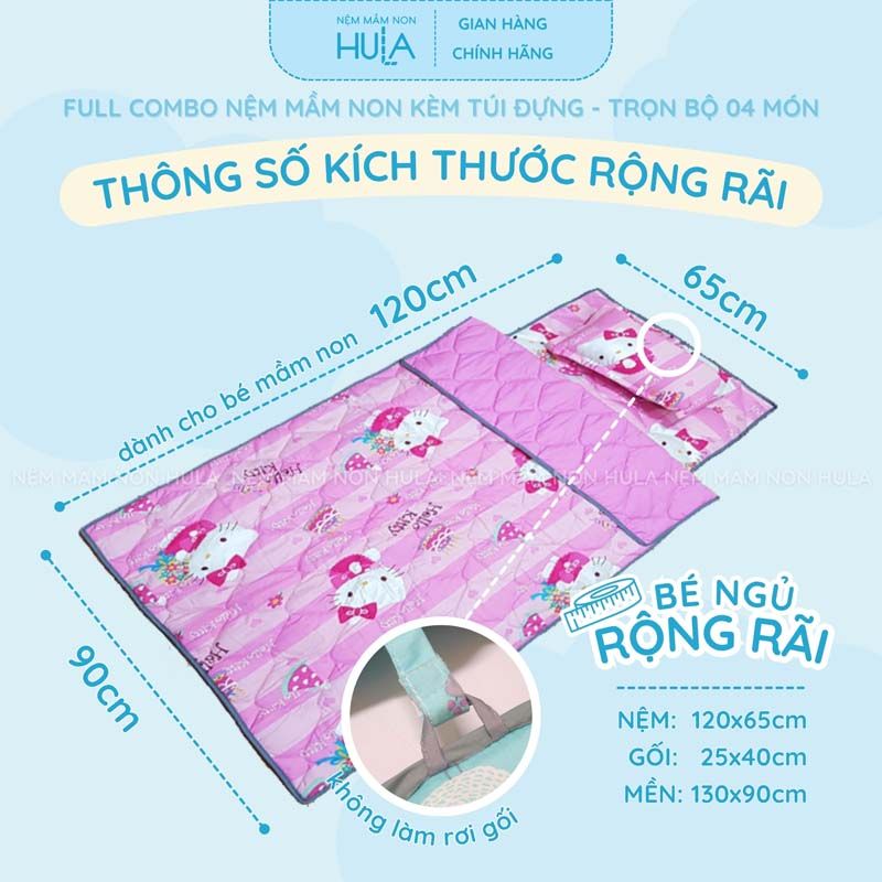 [CHÍNH HÃNG HULA] Full Combo Bộ Nệm Mầm Non 4 Món Họa Tiết Hello Kitty - Có Mền Đắp, Vải Satin Hàn Quốc, Kèm Balo Dây Rút