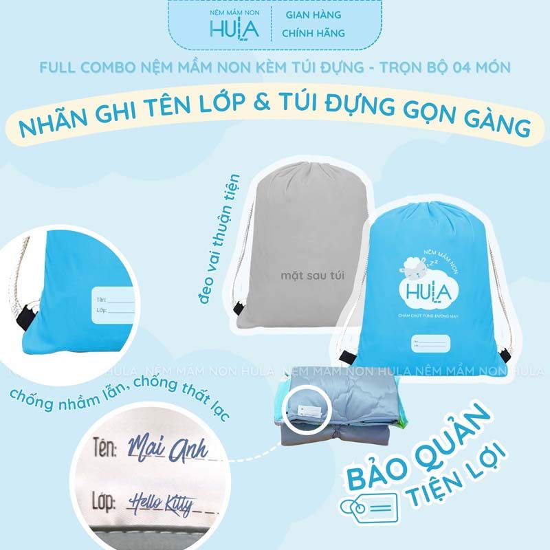 Nhãn ghi tên chống thất lạc: Cả nệm và túi rút đều có khu vực ghi Tên và Lớp (ví dụ: Mai Anh - Lớp Hello Kitty), xóa tan nỗi lo nhầm đồ của con ở trường mầm non.