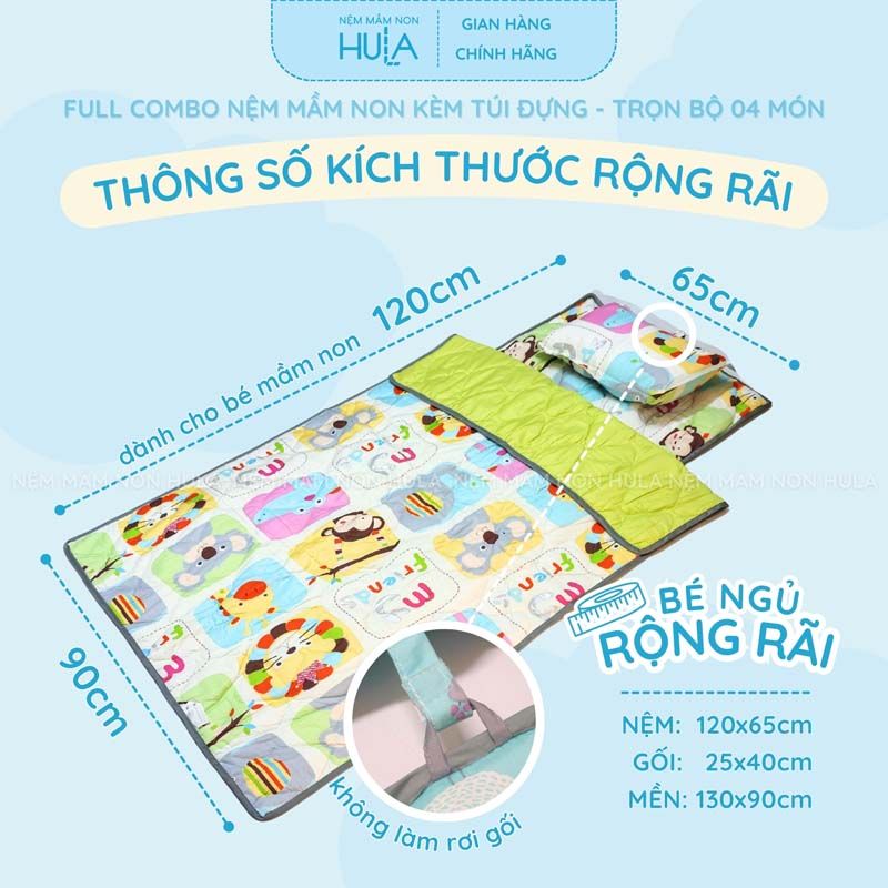 [CHÍNH HÃNG HULA] Full Combo Bộ Nệm Mầm Non 4 Món Họa Tiết Khu Rừng Vui Vẻ - Có Mền Ngủ Đắp, Vải Satin Hàn Quốc, Kèm Balo Dây Rút
