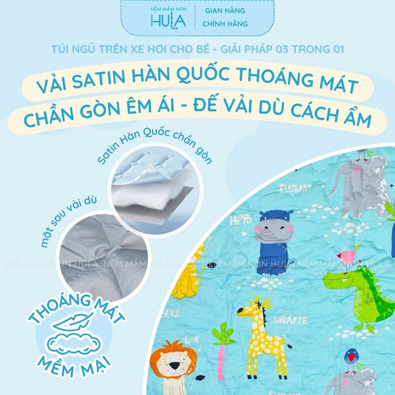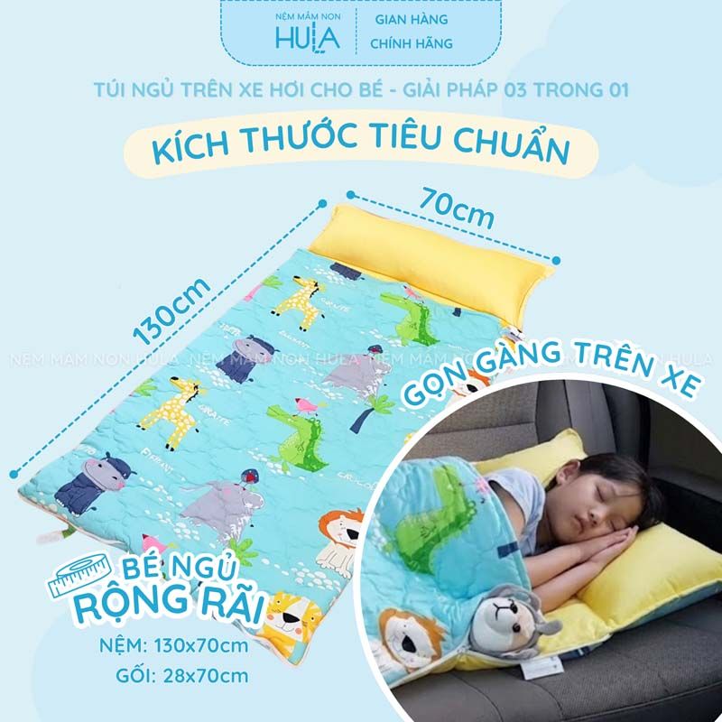 Ba mẹ thường xuyên lo lắng bé ngủ hay đạp chăn sẽ bị lạnh? Bé cần một chỗ ngủ êm ái khi đi lớp, về quê hay nằm trên băng ghế xe hơi ô tô? Túi ngủ mầm non HULA 3 trong 1 họa tiết Rừng Xanh Nhiệt Đới (hươu, sư tử, cá sấu, hà mã ngộ nghĩnh) chính là giải pháp hoàn hảo! Sự kết hợp thông minh giữa Nệm - Mền - Gối trong cùng một sản phẩm giúp chăm sóc giấc ngủ của con yêu trọn vẹn và linh hoạt muôn nơi.